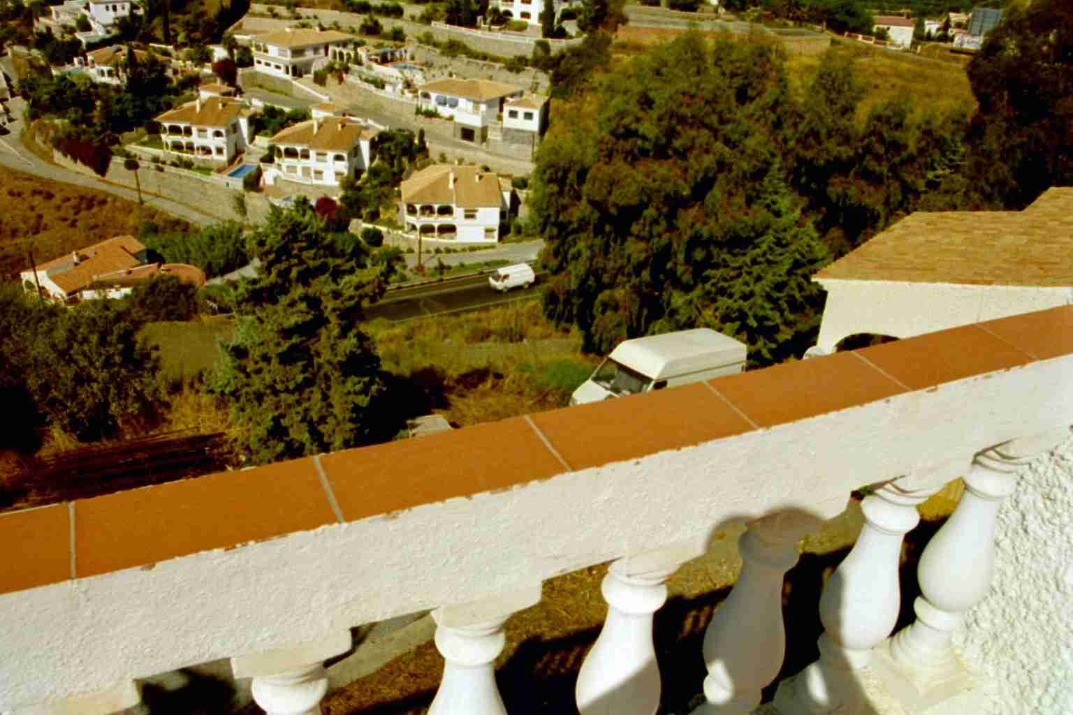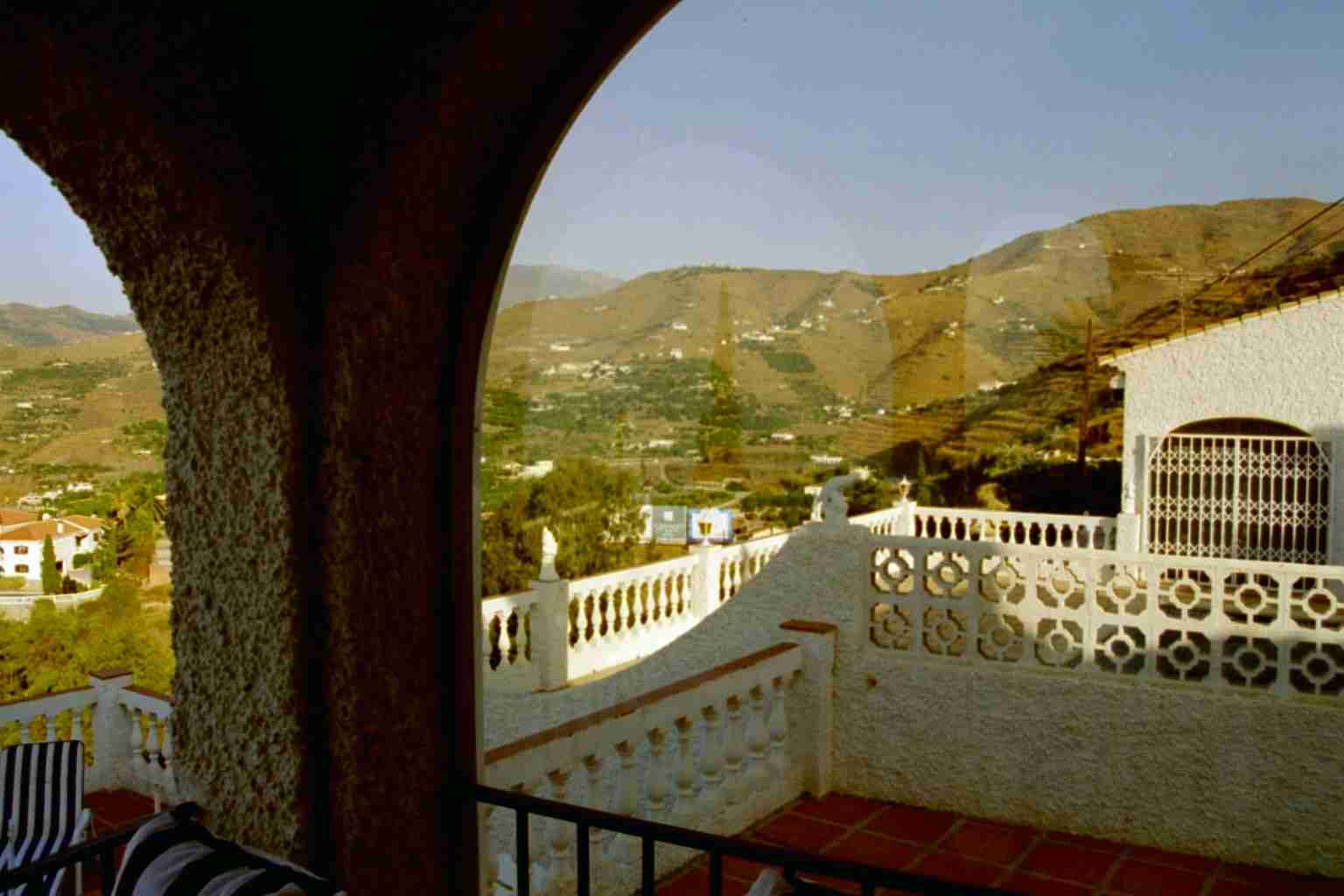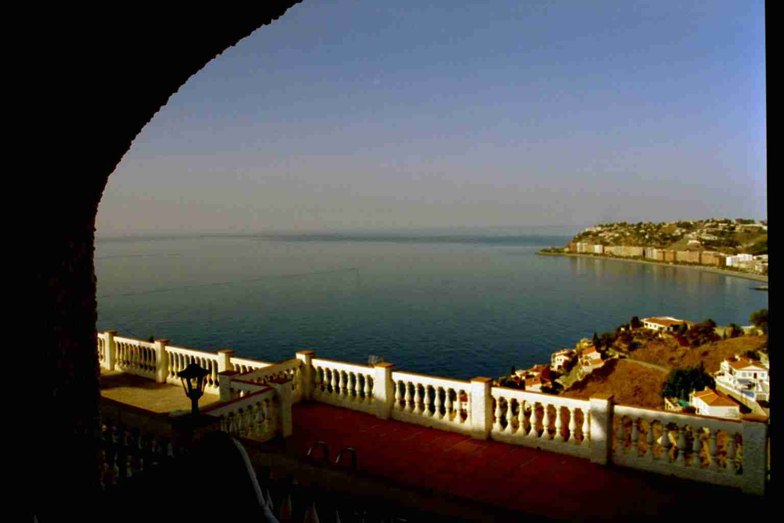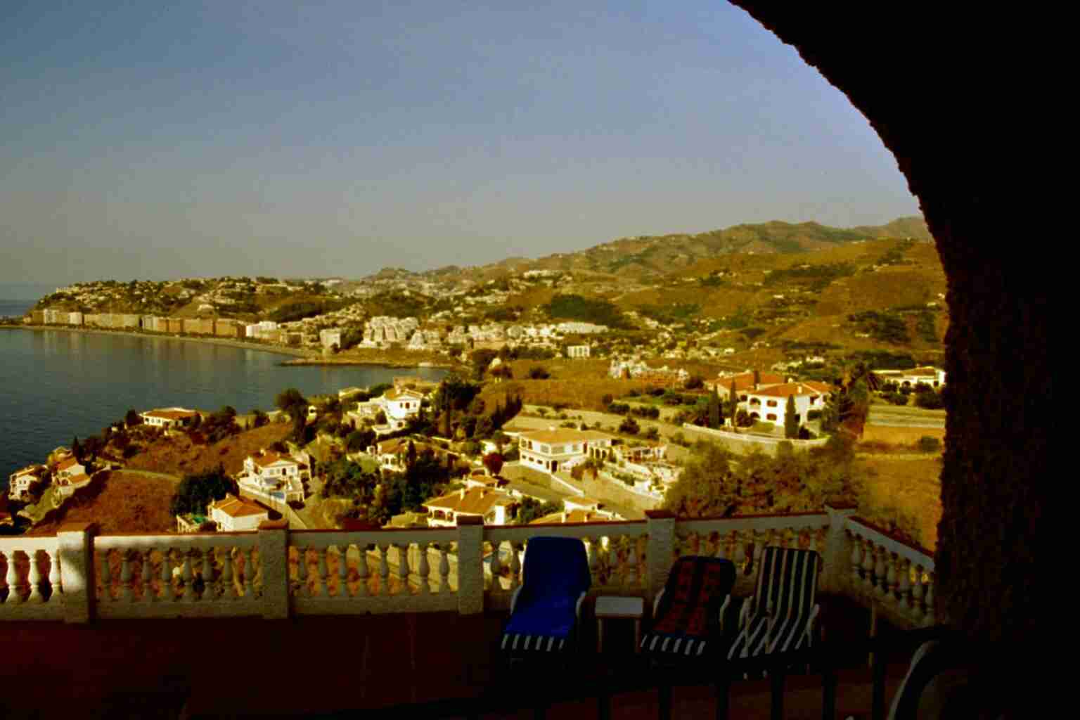 Nach 70 weiteren Kilometern trostloser Steppe erreichten wir wieder die Küste und fanden auch sehr schnell das Büro der Firma "Interservice", wo wir später (ab 16:00 Uhr) unsere Schlüssel erhalten sollten. Da es aber erst 14:00 Uhr war beschlossen wir den nächstgelegenen Supermarkt zu suchen, was uns fast bis nach Malaga führte. Als der schlimmste Kaufrausch abgeklungen war fuhren wir zurück und erreichten um 15:45 Uhr das Büro der Interservice. Vor dem Eingang wurden wir bereits mit erwartungsvollen Augen von drei Holländern erwartet, die uns für die Reiseleitung hielten. Das Büro war noch geschlossen und an der Tür hing ein Schild, dass man nach der Ankunft bitte eine Handy-Nummer anrufen solle. Einen kurzen Anruf, einen Kaffee und 20 Minuten später traf dann auch bereits der Bürovorsteher nebst Tochter ein und führte uns nach den notwendigen Formalitäten zu unserem Domizil. Der Ausblick...